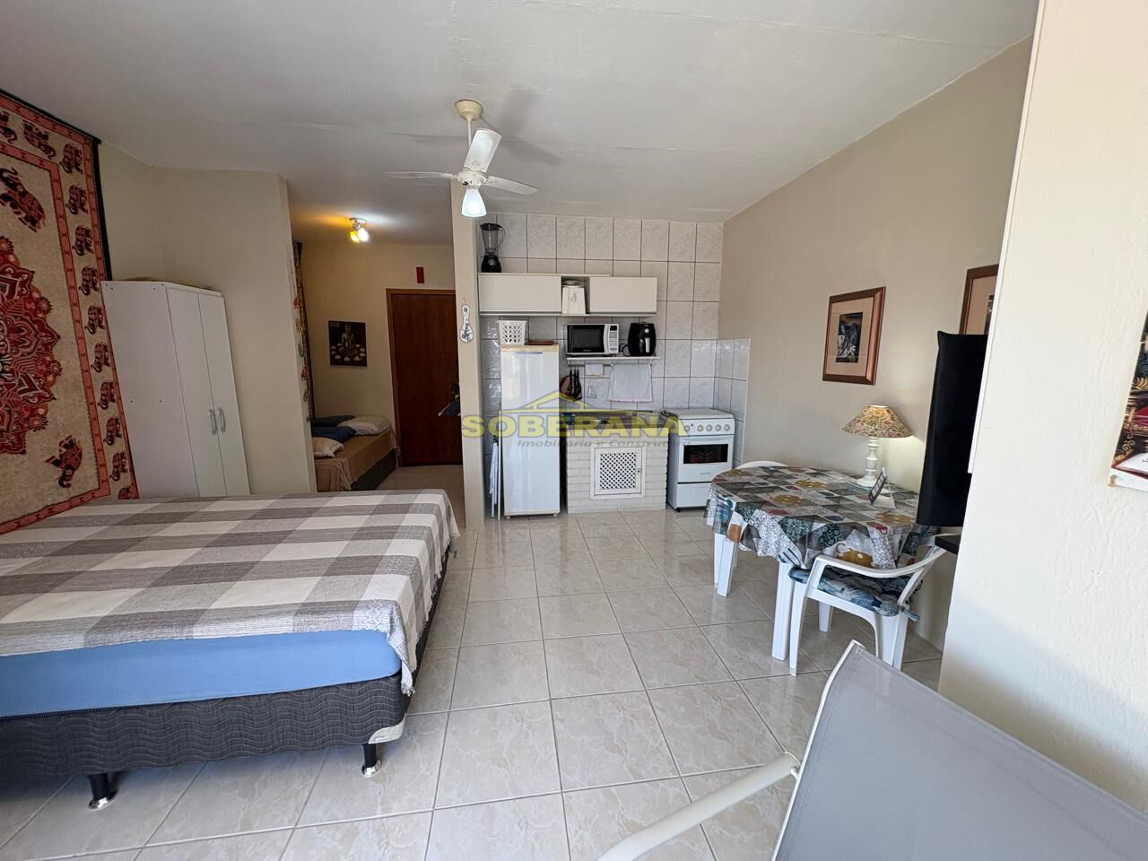 Ótimo apartamento JK com meio dormitório atrás da porta, posição solar sul com vista panorâmica para o por do sol sobre a Serra do Mar, mobiliado, decorado, sala e cozinha conjugada, área de serviço com churrasqueira, sacada fechada e box coberto para carro, condomínio conta com salão de festas, zelador permanente.