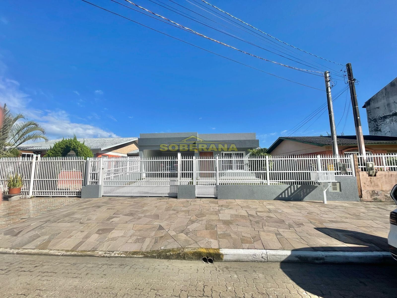 A casa possui três dormitórios, uma suíte, banheiro social, sala e cozinha integradas, garagem para dois carros e anexo nos fundos com churrasqueira e banheiro)