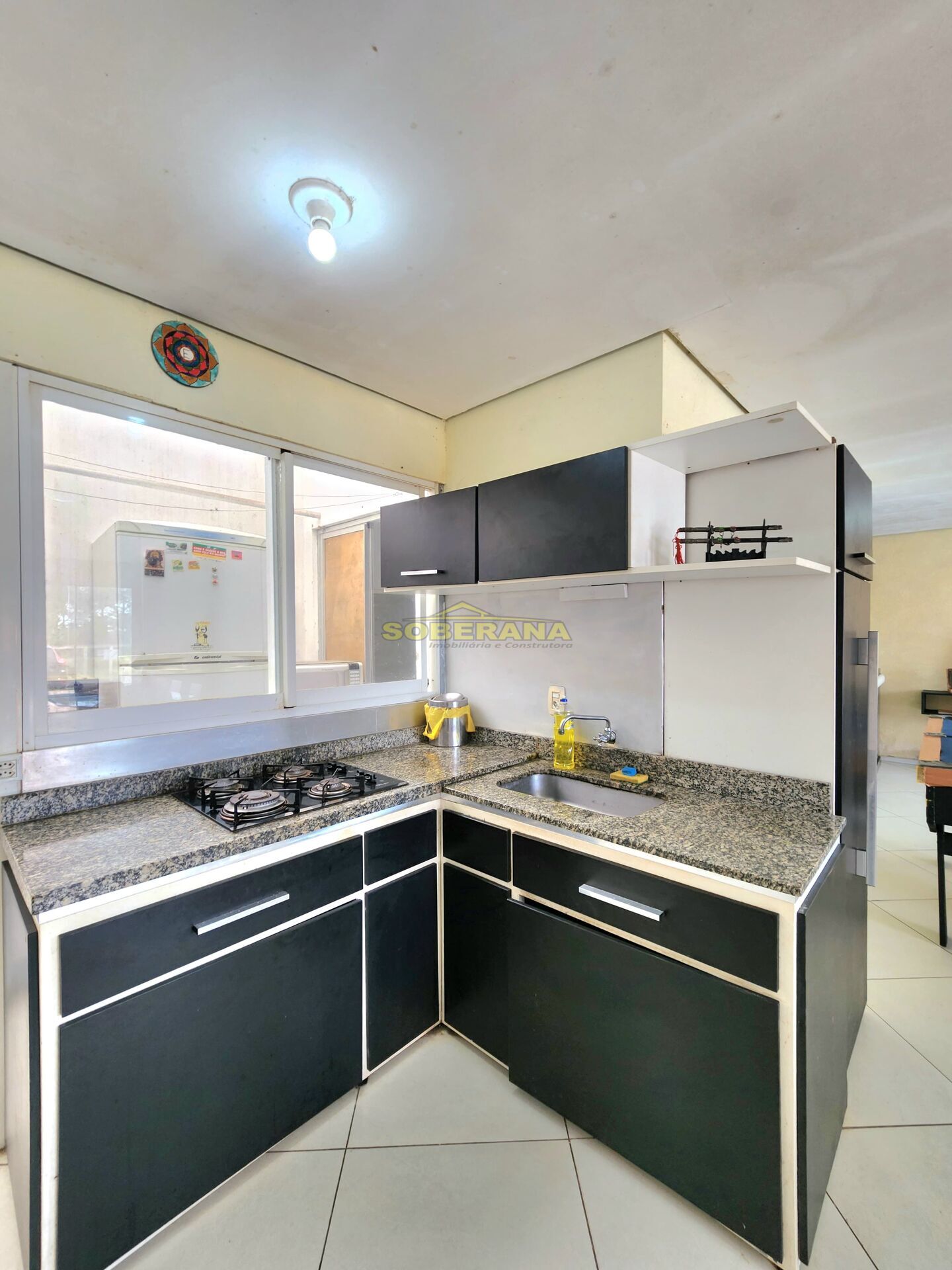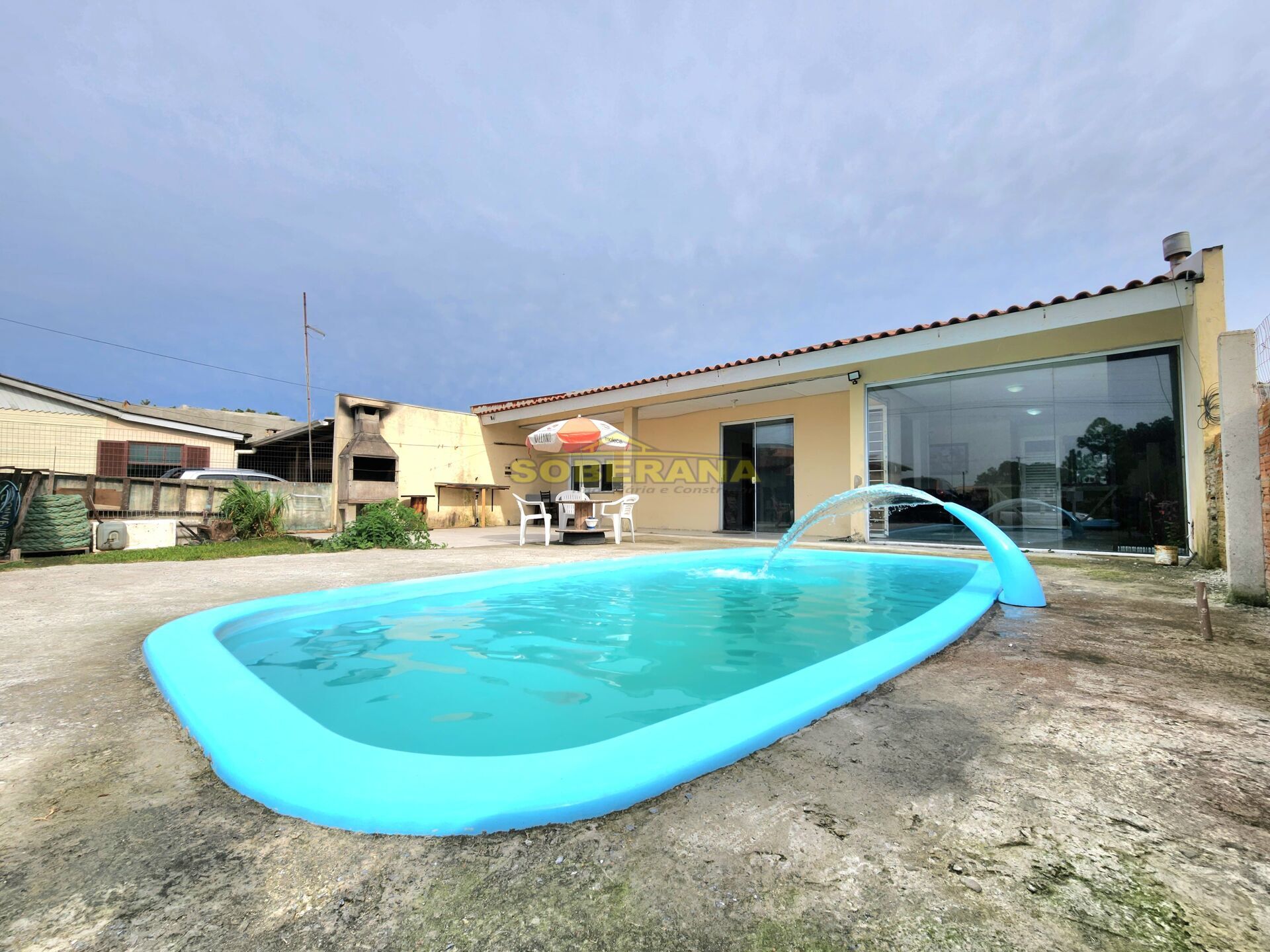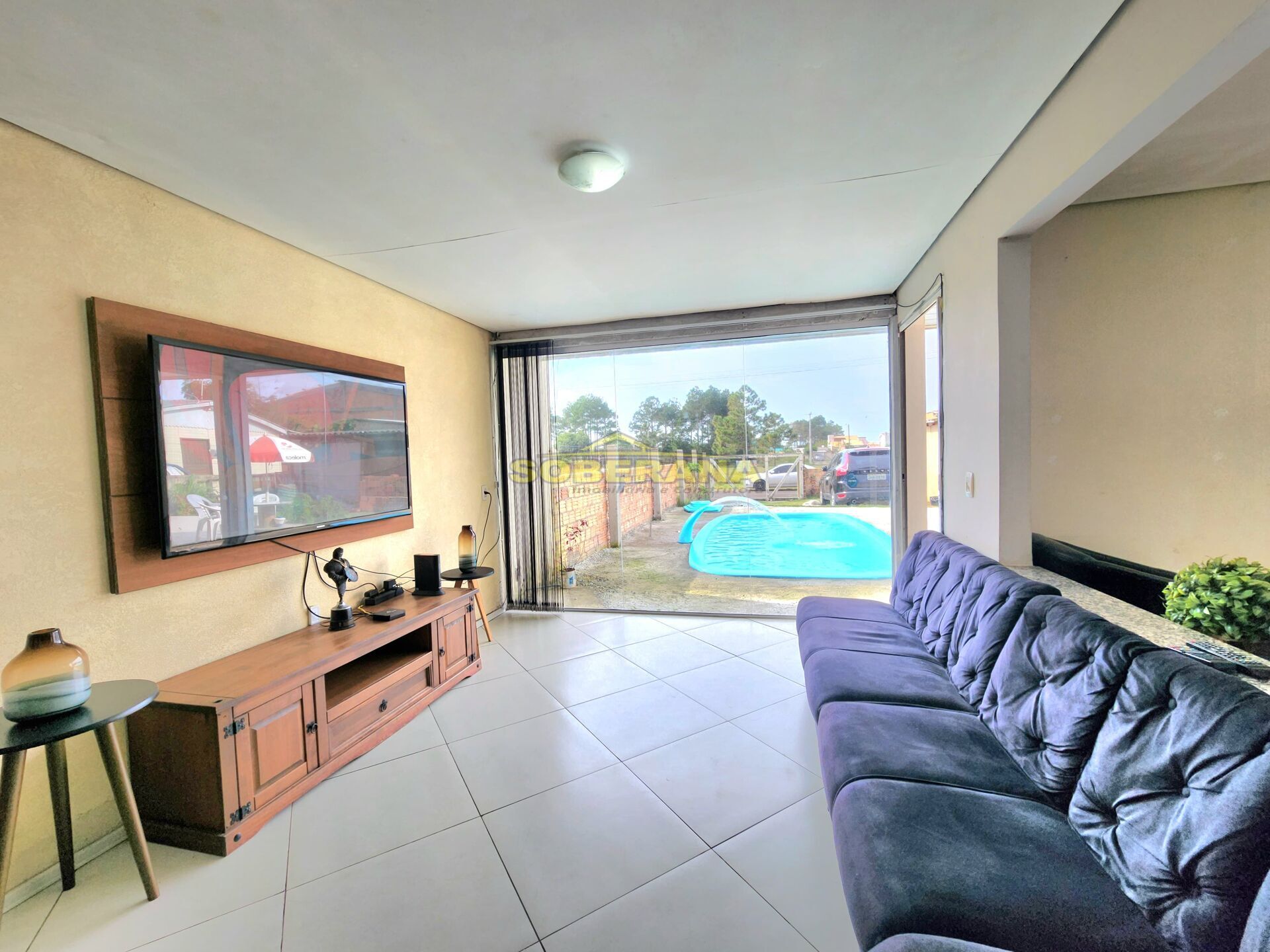 Casa de 3 dormitórios, 2 banheiros, amplo living integrado, rebaixo em gesso, lareira, área de serviço, sala comercial em acabamento e com piscina, poço artesiano e pergolado.