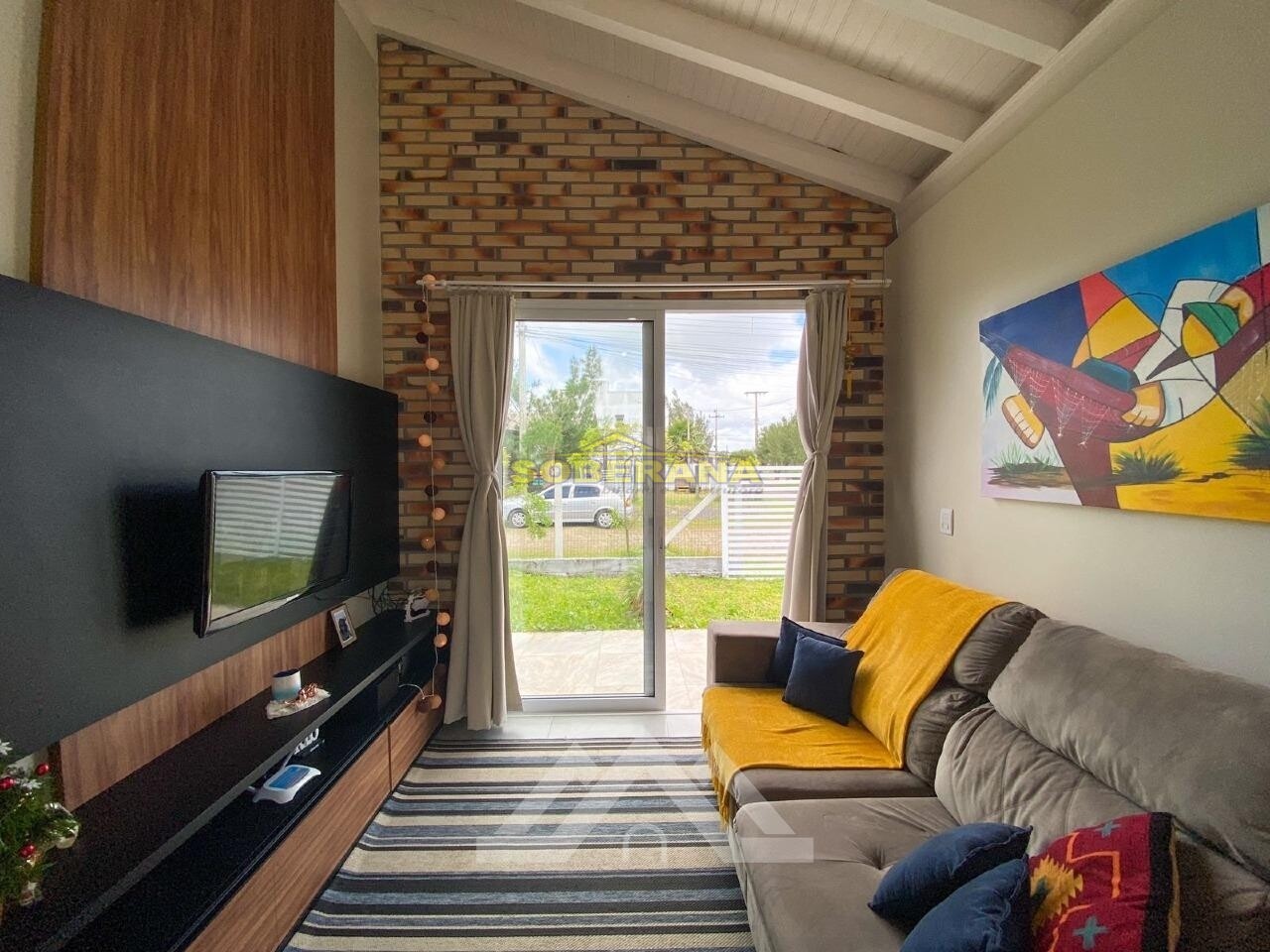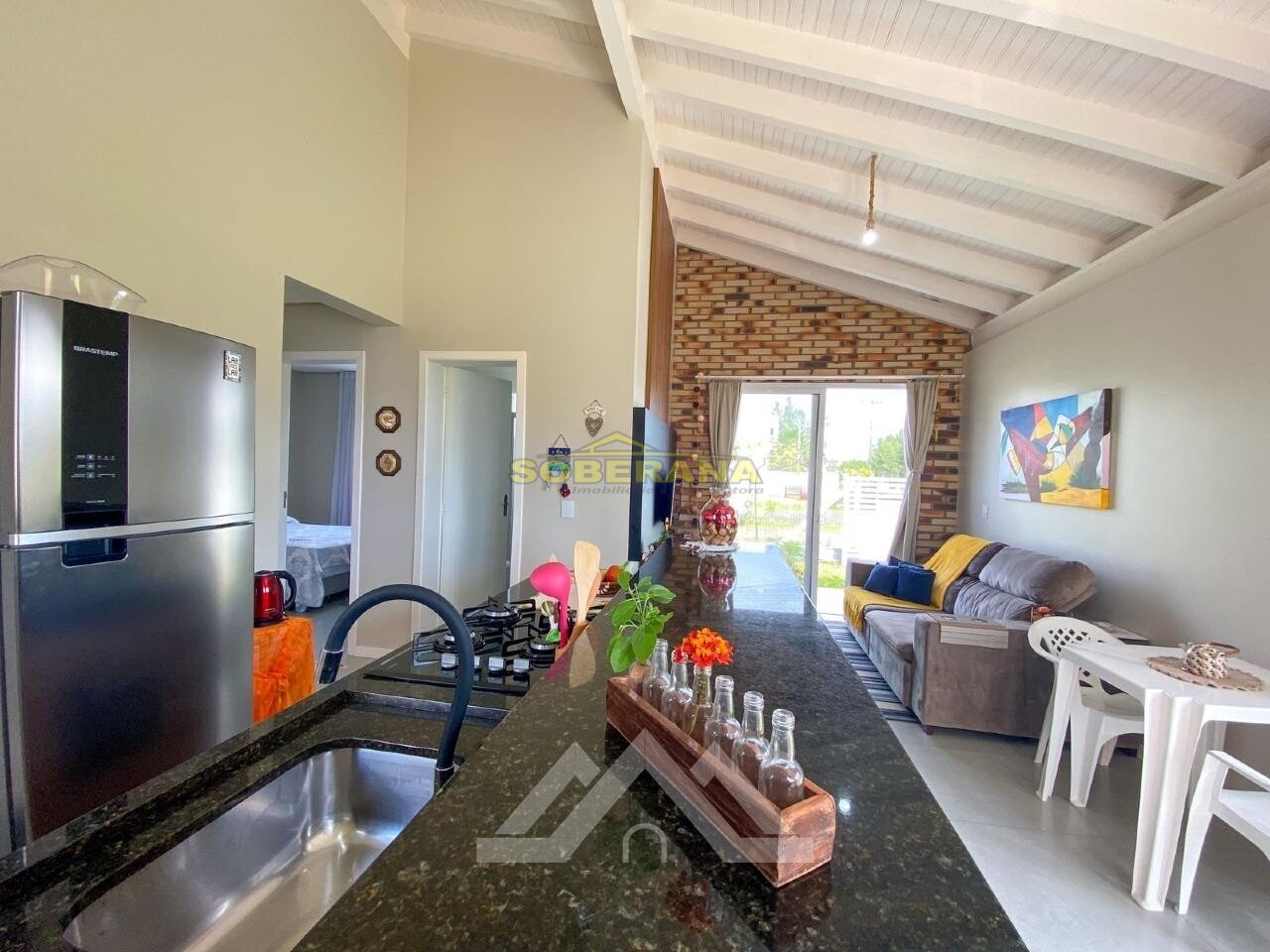 Assim que você entra na casa já sente o aconchego e bom gosto. Um living (com amplas aberturas de alumínio) integrando cozinha (com uma bancada convidativa) e sala de estar. A morada conta também com dois dormitórios e banheiro social.